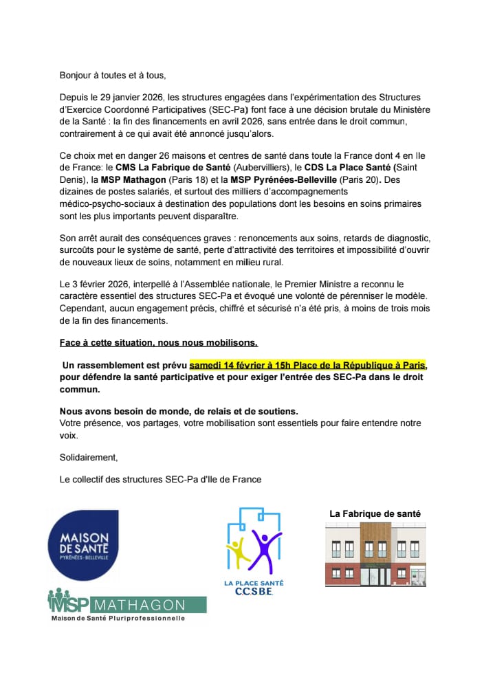 Le Ministère de la santé a annoncé le 29 janvier 2026 qu’il mettait fin à la période transitoire de l’expérimentation du dispositif Structures d’exercice coordonné participatif ou SEC-PA à partir d’avril 2026 alors que ce dispositif devait devenir définitif en passant dans la loi. 26 maisons et centres de santé sont concerné.es. Pour certaines, comme La place santé à Saint-Denis (93) c’est 1/3 du budget de la structure qui disparaît. Le gouvernement propose des financements, mais beaucoup moins importants et pas plus définitifs.